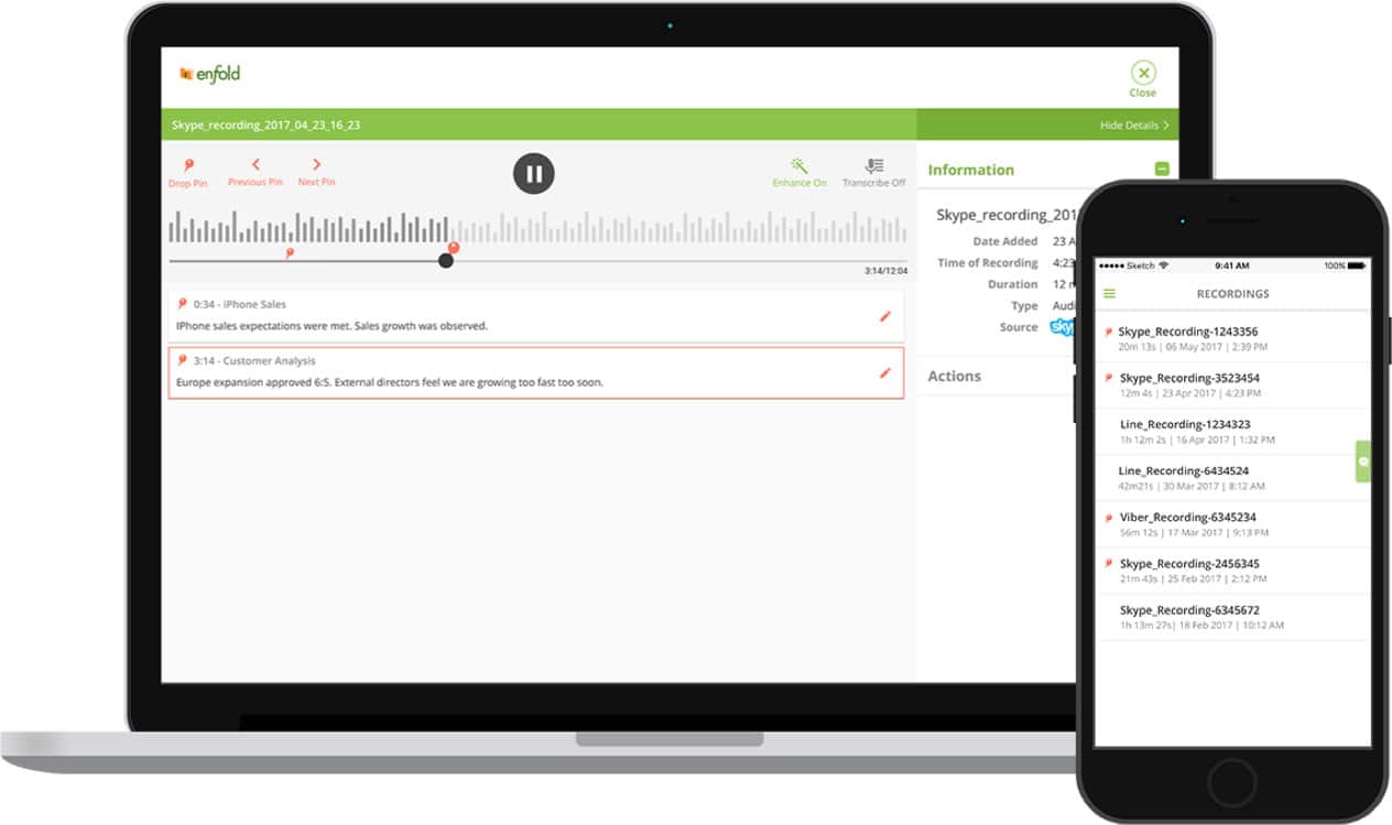 Users can clean noisy recordings which suppresses background noise. Furthermore, the user can annotate recordings with notes at specific times in the recording and can obtain speech to text transcripts.